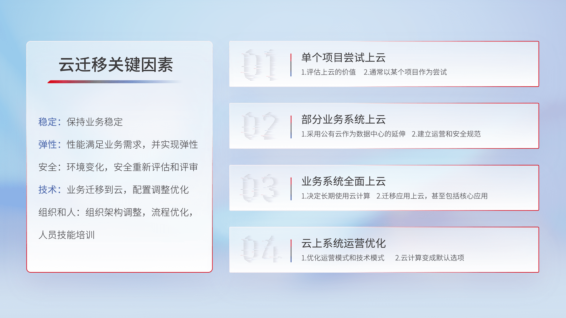结合实际业务,,,从规划设计、、、云平台选型、、、云原生改造、、、数据迁移、、集成交付,,迁移全过程为客户识别最佳上云路径,,做好风险识别管理,,,设计网络架构、、、身份权限、、、、安全审计合规、、、、操作审计、、、、日志审计、、、监控告警策略、、、多站点容灾设计等,,对云上基础设施进行整体规划,,提升IT治理水平,,,,以满足弹性、、高可用、、、、高性能的需求。。。。