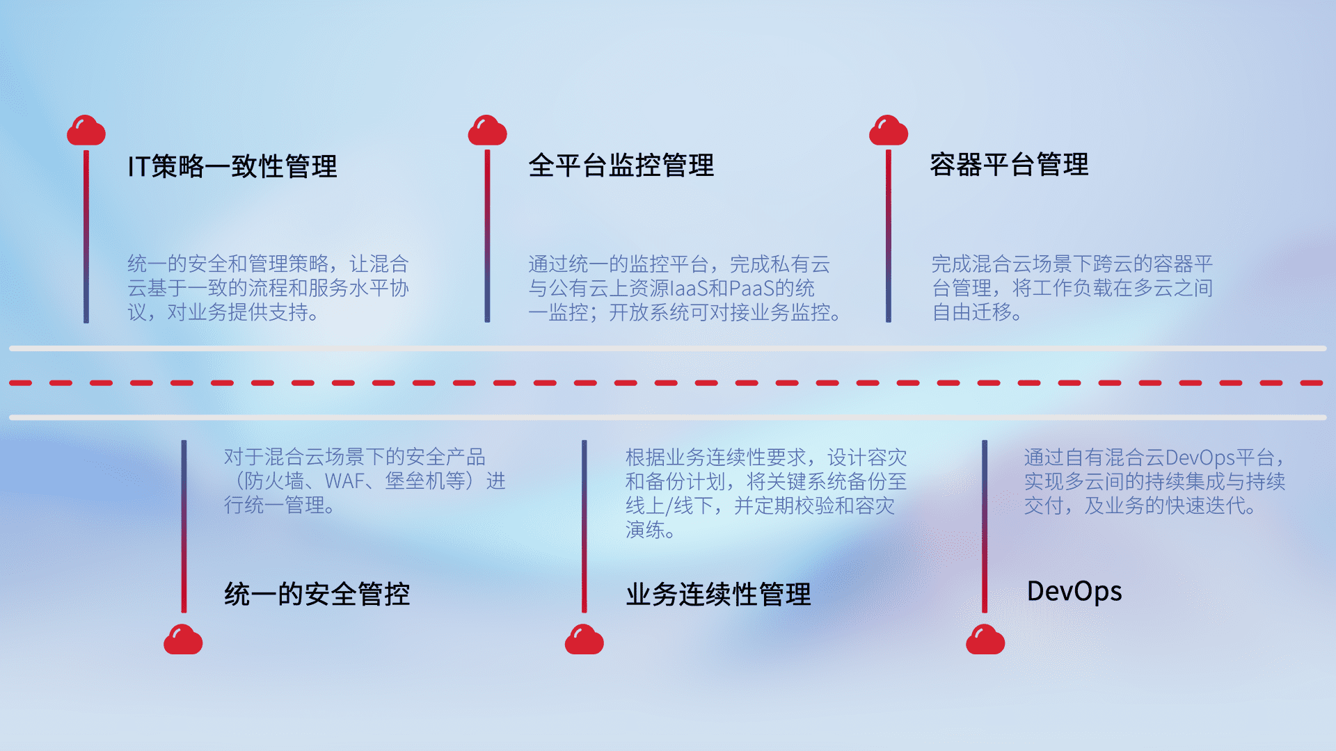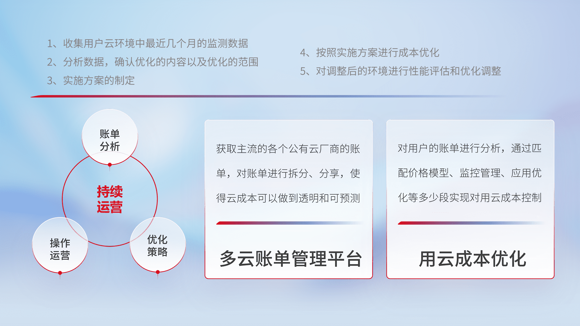 通过多云纳管,,,以统一的资源数据模型把客户的云资源进行抽象和封装,,进而实现对多云资源的统一操作,,保障云资源管理的可靠性、、稳定性与可用性。。量身定制化运维内容,,,配置、、、开发运维、、补丁管理、、备份、、监控、、认证和访问管理、、、、审计和日常巡检等,,,,保障在用云过程中的可靠度,,,稳定度以及高可用率。。。。