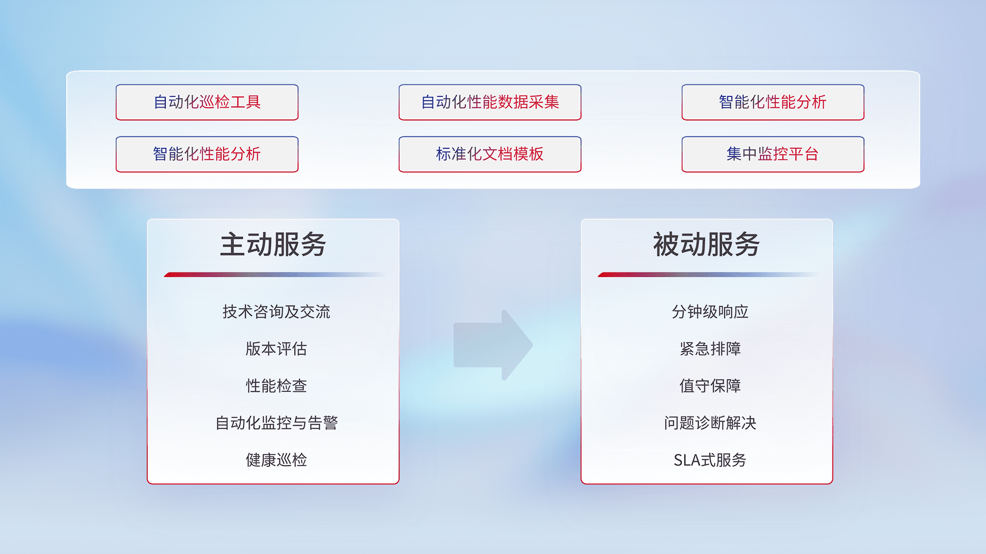 智能化工具和标准化文档,,,保障服务质量,,,提供主动服务(包含技术咨询、、、、版本评估、、、、性能检查、、自动化监控与告警、、、健康巡检)和被动服务包含(分钟级响应、、、、紧急排障、、、、值守保障、、问题诊断解决、、、SLA服务)。。。。