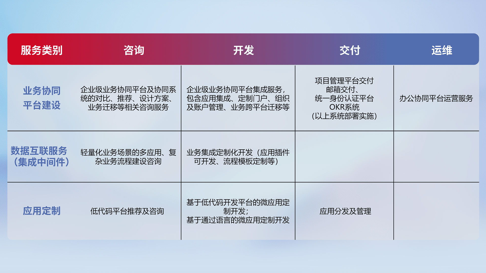 针对钉钉、、、企微、、、、IDaas等平台级产品提供产品的规划、、方案、、、、交付、、定制化开发等服务,,,,实现如统一协同办公、、、智能客户服务、、、、混合会议管理、、智能数据查询、、等业务场景,,,实现数字化转型。。